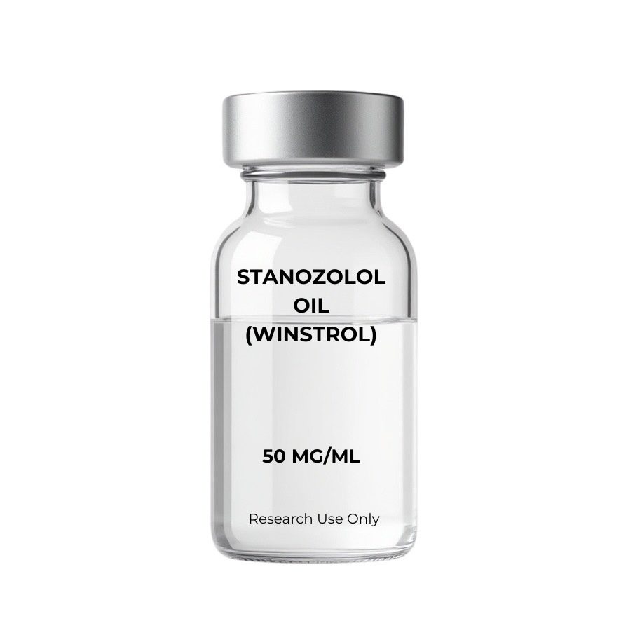 Stanozolol Oil (DHT-derived non-aromatising anabolic-androgenic steroid — oil-based injectable) is stanozolol — C₂₁H₃₂N₂O, MW 328.5 — formulated as an oil-based injectable solution at 50mg/mL. Oil-based stanozolol provides slower release and longer active window compared to the traditional aqueous suspension. 17α-alkylated DHT derivative with high anabolic/moderate androgenic ratio. Does not aromatise to oestrogen. Notable SHBG binding affinity.